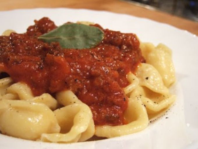 Las orecchiette son un formato de pasta fresca pero sin huevo y hechas con semolino. Se parecen a unas pequeñas orejas, de ahí su nombre (en italiano orecchiette significa "orejitas"). Una de las salsas más comunes con las que se acompañan es la de tomate con carne de caballo