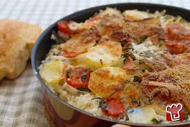 Un plato hecho al horno con patatas, arroz, mejillones, cebolla, tomate y pimienta, gratinado con pan y queso rallado.